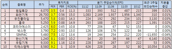 아래 리스트는 우량주 기준으로 사용한 ROE(10%~15%)와 PBR(1.5배 미만) 요건을 만족하는 기계업종 주식을 골라낸 후 이를 PER이 낮은 순으로 정렬한 것이다.