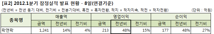 아래 목록은 1분기 실적이 우수한 기업을 빨리 찾는 데 사용하고, 발굴한 기업은 해당 기업의 잠정실적 공시나 분기보고서를 통해 다시 한번 확인해 보는 것이 유용하다. 연결기준 잠정실적을 발표한 기업은 [표2]에 따로 정리했다. 락앤락이 8일 연결기준 1분기 잠정실적을 발표했다.
