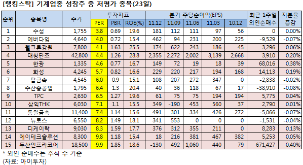 기계업종 성장주의 기준은 기계업종 주식 중 ROE(자기자본이익률)가 15~30% 이내이고, PBR(주가순자산배수)이 2배 미만인 종목들이다. 이런 기준으로 선정한 15개 종목은 모두 PER이 3.8배~9.9배 사이에 해당됐다.