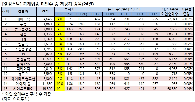 현대에버다임8,480원, ▲270원, 3.29% 외에 수성웹툰3,195원, ▼-15원, -0.47%, 웰크론강원, 대한광통신1,884원, ▼-12원, -0.63%, 화성밸브7,800원, ▲230원, 3.04%, 탑금속, 수산중공업, TPC2,015원, ▼-5원, -0.25%, 동일금속7,860원, ▲100원, 1.29%, 삼익THK9,960원, 0원, 0%, 디케이락9,590원, ▲10원, 0.1%, 뉴로스, 에이테크솔루션5,390원, ▲10원, 0.19%, 와이지-원4,945원, ▼-5원, -0.1%, 하이록코리아32,150원, ▲150원, 0.47%가 15선에 포함됐다. 순이익은 IFRS 개별기준이다. 뉴로스는 올해 2월 신규상장된 종목으로 지난해 2분기 이전 주당순이익 자료가 없다. 15선 중에서 올해 1분기 실적이 에버다임, 한광, 탑금속, 수산중공업, 동일금속, 삼익THK, 디케이락, 하이록코리아의 8종목이다.