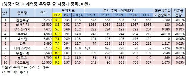 이 가운데 원일특강7,640원, ▲50원, 0.66%은 PER이 3.2배로 기계 업종 우량주 중에서 가장 낮았다. ROE는 10.3%, PBR은 0.33배였다.