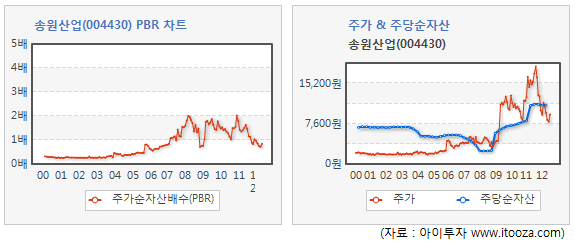 송원산업의 주가순자산배수(PBR)는 0.8배로 나타났다. 이는 5년 평균치인 1.3배에 비해 37% 가량 낮은 수준이다. 송원산업의 PBR은 2007년 이후 1이하로 내려갔던 적이 많지 않다. 2008년 금융위기 시절 이후 처음이다. 10년간 최저치는 0.3배, 최대치는 2배이나 5년 동안의 최저치는 0.7배다. PBR은 시가총액을 자본총계로 나눈 값으로 낮을수록 주식이 저평가됐다고 판단한다.