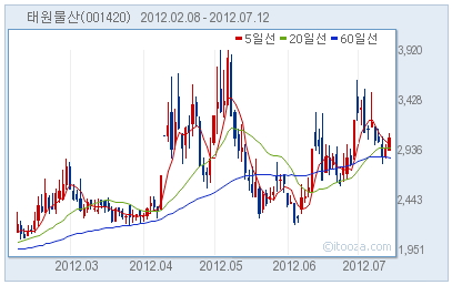 태원물산3,375원, ▲65원, 1.96%이 연이틀 상승세다. 12일 오후 1시 27분 현재 전일 대비 2.5% 상승한 3030원을 기록중이다.