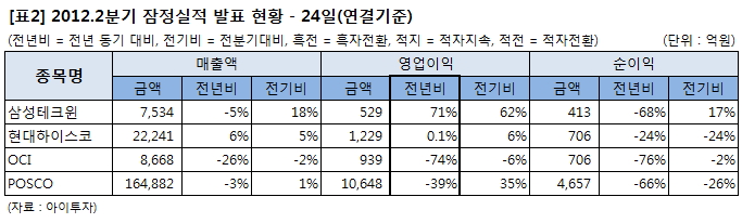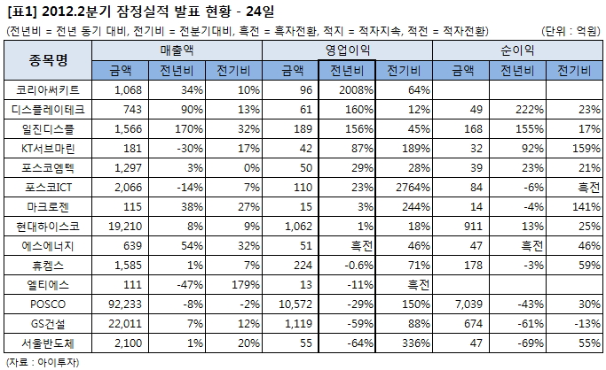 24일 2분기 잠정실적을 발표한 기업의 매출액, 영업이익, 순이익 금액과 성장률을 아이투자가 정리했다.