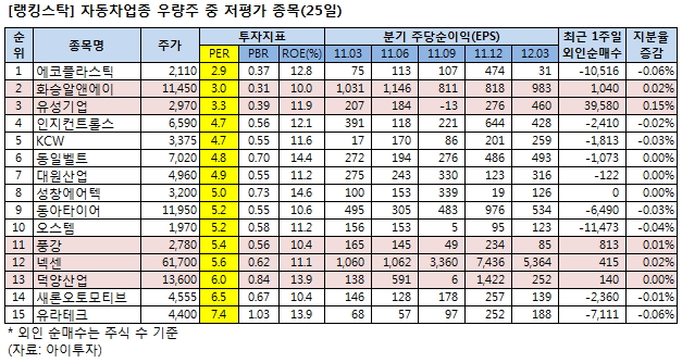 자동차 업종 우량주 중에서 PER(주가수익배수) 기준으로 가장 저평가된 종목은 에코플라스틱3,020원, ▲60원, 2.03%으로 나타났다. 이는 지난 25일 종가 기준, 자동차 업종 우량주 중 대표적인 저평가 지표인 PER이 낮은 종목 15개를 선정한 결과에 따른 것이다.
