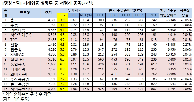 선정 기준은 기계업종 주식 중 ROE(자기자본이익률)가 15~30% 이내이고, PBR(주가순자산배수)이 2배 미만인 종목들이다. 이런 기준으로 선정한 15개 종목은 모두 PER이 3.8배~9.5배 사이에 해당됐다. 연결 지배지분 또는 지분법이 적용된 순이익과 자본을 적용해 투자지표를 산출했다.