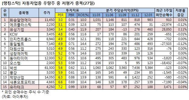 이 가운데 화승알앤에이3,150원, ▲35원, 1.12%는 PER이 3배로 자동차 업종 우량주 중에서 가장 낮았다. ROE는 10%, PBR은 0.39배다.