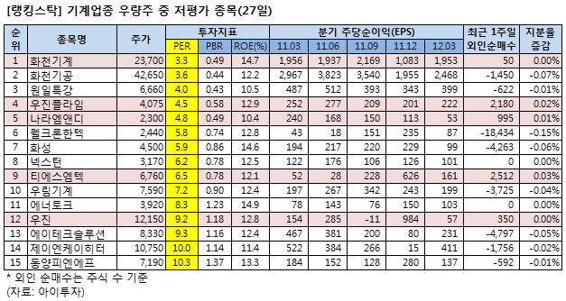 이 가운데 화천기계4,610원, ▲75원, 1.65%는 PER이 3.3배로 기계 업종 우량주 중에서 가장 낮았다. ROE는 14.7%, PBR은 0.49배였다.