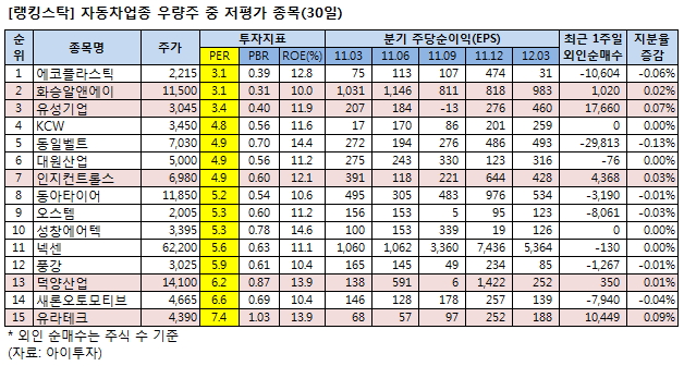 자동차 업종 우량주 중에서 PER(주가수익배수) 기준으로 가장 저평가된 종목은 에코플라스틱3,015원, ▲55원, 1.86%으로 나타났다. 이는 지난 30일 종가 기준, 자동차 업종 우량주 중 대표적인 저평가 지표인 PER이 낮은 종목 15개를 선정한 결과에 따른 것이다.