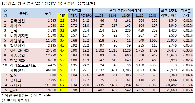 이 가운데 케이비아이동국실업481원, ▲12원, 2.56%은 PER이 2.2배로 자동차 업종 성장주 중에서 가장 낮았다. ROE는 24.2%, PBR은 0.54배였다.