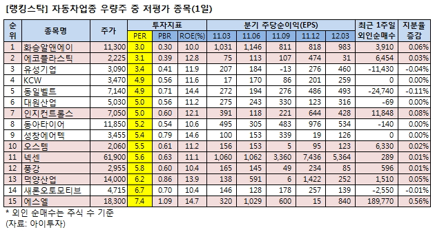 이 가운데 화승알앤에이3,150원, ▲35원, 1.12%는 PER이 3배로 자동차 업종 우량주 중에서 가장 낮았다. ROE는 10%, PBR은 0.3배다.