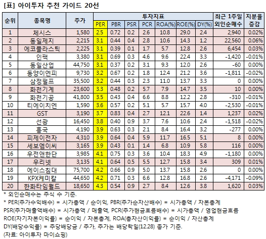체시스 외에 동일제지, 에코플라스틱3,015원, ▲55원, 1.86%, 인팩6,100원, ▼-70원, -1.13%, 동일산업39,200원, ▲300원, 0.77%, 동양이엔피24,200원, ▲200원, 0.83%, 삼정펄프30,450원, ▲350원, 1.16%, 화천기계4,585원, ▲50원, 1.1%, 화천기공31,550원, ▼-200원, -0.63%, 티에이치엔6,130원, ▼-220원, -3.46%이 상위 10선에 해당했다. 추천 가이드 기준으로 선정한 20개 종목의 PER은 2.5배~ 4.3배다. 연결 지배지분 또는 지분법이 적용된 순이익과 자본을 적용해 투자지표를 산출했다.