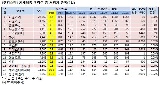 이 가운데 화천기계4,600원, ▲65원, 1.43%는 PER이 3.3배로 기계 업종 우량주 중에서 가장 낮았다. ROE는 14.7%, PBR은 0.49배였다.