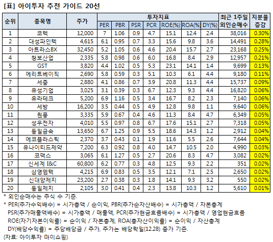 아래 리스트는 아이투자 추천 가이드 요건을 만족하는 종목을 골라낸 후 이를 최근 1주일간 외국인 보유 지분증가율이 높은 순으로 정렬한 것이다.