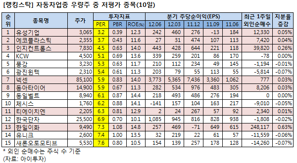 자동차 업종 우량주의 기준은 자동차주 중 ROE(자기자본이익률)가 10~15% 이내이고, PBR(주가순자산배수)이 1.5배 미만인 종목들이다. 이런 기준으로 선정한 15개 종목은 모두 PER이 3.2배~7.6배 사이에 해당됐다. 연결 지배지분 또는 지분법이 적용된 순이익과 자본을 적용해 투자지표를 산출했다.