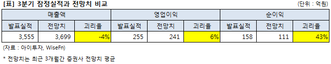 8일 잠정실적 공시에 따르면 한솔제지의 3분기 매출액은 증권사 전망치를 4% 밑도는 3555억원을 기록했다. 하지만 영업이익과 순이익은 전망치를 6%와 43% 웃도는 255억원과 158억원을 기록했다. 전년 동기와 비교하면 매출액은 5% 줄고, 영업이익과 순이익은 각각 58%와 1600% 늘었다.