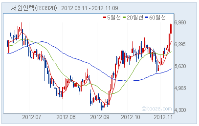 서원인텍5,600원, ▲60원, 1.08%이 연일 상승세다. 9일 오후 2시 2분 현재 전일보다 4.5% 상승한 6920원을 기록 중이다.