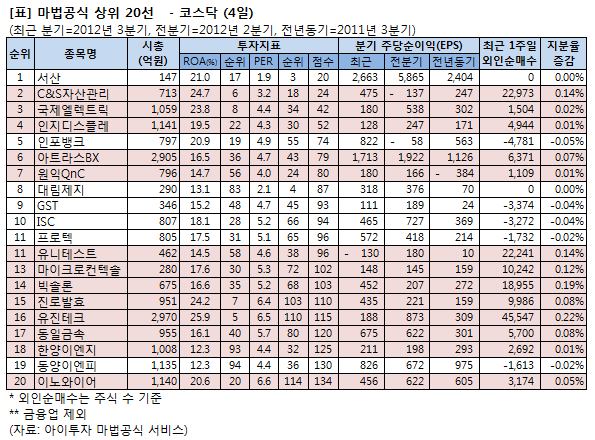 서산1,484원, ▼-5원, -0.34%은 ROA 21.0%로 17위, PER 1.9배로 3위를 기록해 합계 점수 20점으로 1위를 차지했다. 이외 {C&S자산관리}, 국제엘렉트릭, 인지디스플레1,345원, ▼-7원, -0.52%, 인포뱅크5,200원, ▲80원, 1.56%, 아트라스BX, 원익QnC19,240원, ▲60원, 0.31%, 대림제지7,200원, ▲30원, 0.42%, GST25,050원, ▼-100원, -0.4%, ISC103,700원, ▲1,100원, 1.07%가 코스닥 상위 10선에 포함됐다. 연결 지배지분 또는 지분법이 적용된 순이익과 자본을 적용해 투자지표를 산출했다. 분할 등으로 일시적인 이익이 발생했던 기업은 제외했다.