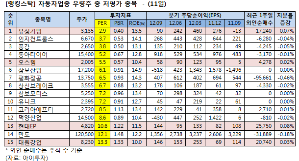 자동차 업종 우량주 중에서 PER(주가수익배수) 기준으로 가장 저평가된 종목은 유성기업2,030원, ▲46원, 2.32%으로 나타났다. 이는 지난 11일 종가 기준, 자동차 업종 우량주 중 대표적인 저평가 지표인 PER이 낮은 종목 15개를 선정한 결과에 따른 것이다.