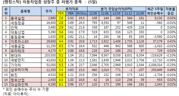 이 가운데 케이비아이동국실업482원, ▲13원, 2.77%의 PER이 2.6배로 자동차 업종 성장주 중에서 가장 낮았다. ROE는 19.3%, PBR은 0.50배다.