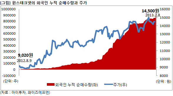 12일 금융정보 제공업체인 와이즈에프엔에 따르면 최근 6개월간 외인은 윈스테크넷 주식 약 90만주를 순매수했다. 이는 총 발행 주식의 8.5%에 이르는 것이다. 최근 한 달간도 11만5000주(1.1%)를 순매수하며 '러브콜'을 이어가고 있다.