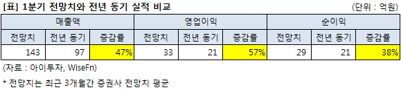 와이즈에프엔에 따르면 최근 3개월간 증권사가 전망한 윈스테크넷의 올해 1분기 매출액은 전년 동기보다 47% 늘어난 143억원이다. 영업이익은 57% 늘어난 33억원, 순이익은 38% 늘어난 29억원이다.