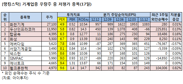 [랭킹스탁] 저평가 우량주 10선-기계업종