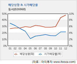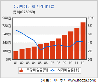 배당 매력도 주목할 만하다. 동서는 지난 10년간 주당배당금을 꾸준히 늘려왔다. 2001년 176원이었던 주당배당금은 지난해 800원으로 불어났다. 시가배당률 또한 2005년을 제외하고 3% 이상을 유지해왔다. 동서의 배당성향은 상장 초기부터 지난 2010년까지 30% 수준이었으며, 지난해엔 48%로 한 단계 더 올라섰다.
