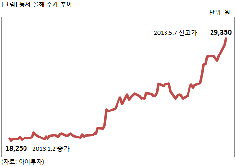 동서27,500원, ▲150원, 0.55%가 또 신고가를 경신했다. 전날 2만8700원을 기록하며 상장 이후 가장 높은 가격을 형성했던 동서는 7일 역시 상승세를 지속하며 신고가인 2만9350원을 달성했다. 올해 들어 누적 주가 상승률은 61%다.