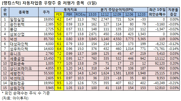 이 가운데 일정실업18,550원, 0원, 0%의 PER이 4.2배로 자동차 업종 우량주 중에서 가장 낮았다. ROE는 11.3%, PBR은 0.47배다.