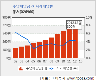 이런 가운데 동서는 배당 매력도 보유하고 있다. 이 회사는 지난 10년간 배당금을 꾸준히 늘려왔다. 2002년 227원이었던 주당배당금은 지난해 800원까지 불어났다. 시가배당률 또한 2005년을 제외하고 3% 이상을 유지해왔다. 동서의 배당성향은 상장 초기부터 2010년까지 30% 수준이었으나, 지난해엔 48%로 한 단계 올라섰다. 만약 올해 주당배당금이 지난해와 동일하게 책정된다면, 현 주가 기준 예상 배당수익률은 2.9%다.