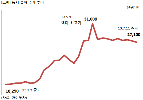 동서는 1월 초까지만 해도 1만8000원 초반대에 머물고 있었으나, 2월 말부터 본격적으로 상승세를 타기 시작했다. 그리고 지난 5월 초 역대 최고가를 달성했다. 이후 하락 전환 해 최근엔 2만원 중후반 대를 횡보하고 있지만, 연초에 비하면 여전히 50% 가까이 오른 수준이다.