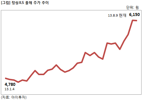 정상제이엘에스6,510원, ▲10원, 0.15%(이하 '정상JLS')가 상승세다. 9일 오전 11시 2분 현재 전일 대비 2.2% 오른 6150원에 거래되고 있다. 정상JLS는 최근 부진한 실적을 발표했음에도 불구하고 주가가 견조한 흐름을 보이고 있다. 올 초 4000원 중반대였던 주가는 꾸준히 상승해 최근 6000원 대에 안착했다.