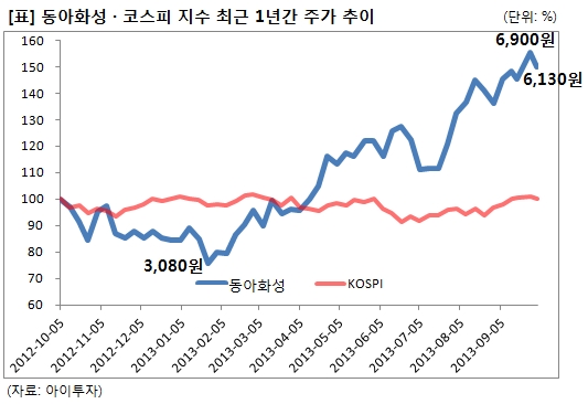 동아화성6,290원, ▼-60원, -0.94%의 주가가 상승하고 있다. 동아화성은 지난 1월 2080원에서 올해 9월 6900원까지 8개월 동안 121% 급등했다. 현재 52주 최고가 대비 11% 낮은 6130원대에 거래되고 있다. 동아화성의 최근 1년간 수익률은 코스피 지수를 50%p 상회했다. 동아화성은 다시 주가 상승을 이어갈 수 있을까.