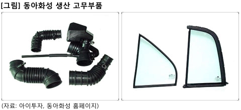 동아화성은 국내 고무소재 부품 1위 회사다. 자동차 엔진오일 누수를 막는 가스켓, 엔진에 공기를 전달하는 호스 등 자동차 고무부품과 세탁기용 가스켓 등 가전용 고무부품을 제조한다. 자동차 부품은 현대차 및 기아차에, LG전자, 삼성전자의 드럼세탁기 및 일본 가전업체에 납품한다. 매출비중은 자동차 49%, 가전 51%며 주력 품목의 점유율이 각각 60%를 넘어 1위를 차지하고 있다.