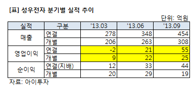 그러나 3분기 자회사 실적이 턴어라운드에 성공하면서 연결 영업이익이 개별 영업이익을 두 배 넘게 웃돌았다. 지배지분 순이익도 마찬가지다. 성우전자의 자회사 합산 순이익은 25억원 이상을 기록한 것으로 추정된다. 상반기 적자를 기록한 것에 비하면 크게 개선된 셈이다.