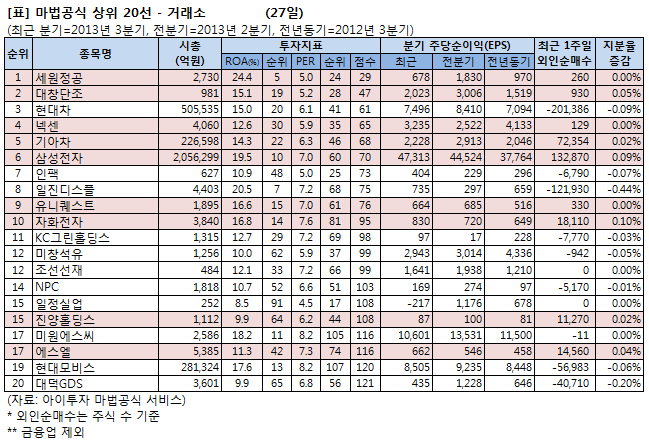 그 외 대창단조6,400원, ▼-10원, -0.16%, 현대차261,000원, ▲3,500원, 1.36%, 넥센5,660원, ▲60원, 1.07%, 기아차, 삼성전자101,800원, ▲2,500원, 2.52%, 인팩6,100원, ▼-70원, -1.13%, 일진디스플902원, 0원, 0%, 유니퀘스트5,930원, 0원, 0%, 자화전자17,480원, ▲300원, 1.75%가 거래소 상위 10선에 포함됐다. 연결 지배지분 또는 지분법이 적용된 순이익과 자본을 적용해 투자지표를 산출했다. 분할 등으로 일시적인 이익이 발생했던 기업은 제외했다.