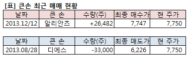 전일 금융감독원 전자공시에 따르면 알리안츠글로벌인베스터스는 직전 보고서 제출일인 2013년 11월 22일 이후 13만5733주를 추가 매수하며 지분을 종전 5%에서 6.08%로 늘렸다. 최근 거래일은 지난달 12일로 7747원에 2만6482주를 장내 매수했다.