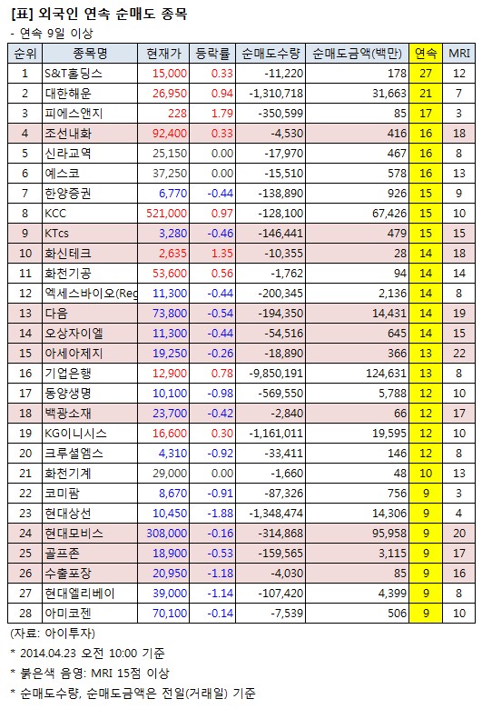 전일까지 외국인 투자자가 9일 이상 연속 순매도한 종목은 모두 28개로 {S&T홀딩스}(27일)에 이어 대한해운1,744원, ▲54원, 3.2%(21일) 등의 연속 순매도 기간이 길었다.