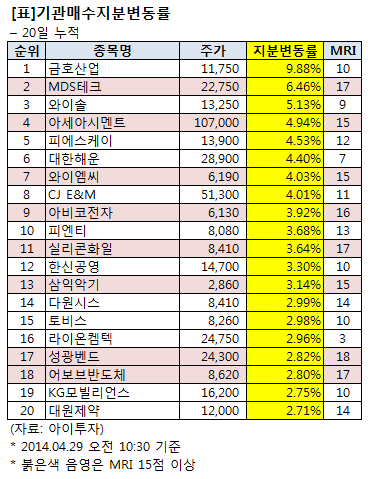 최근 20일 기관 순매수 지분율이 높은 종목으로는 1위 금호산업(9.88%)에 이어 MDS테크1,333원, ▲12원, 0.91%(6.46%), 와이솔5,790원, ▲10원, 0.17%(5.13%), 아세아시멘트11,910원, ▲480원, 4.2%(4.94%) 등이 상위권에 올랐다. 주식MRI 점수가 15점 이상인 기업은 MDS테크1,333원, ▲12원, 0.91%, 아세아시멘트11,910원, ▲480원, 4.2% 등을 포함, 총 8개다.