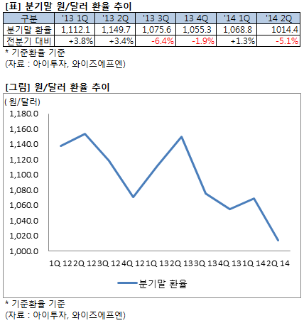 영업이익과 대조적으로 지난 2분기 순이익(연결 지배지분)은 10억7700만원으로 전년 동기에 비해 26% 줄었다. 이는 환율 하락에 따른 외화자산평가손실이 영향을 준 결과로 보인다. 지난 1분기 분기보고서에 따르면 분기 말 원/달러 및 원/홍콩달러 환율이 5% 내리면 1억7000만원의 손실이 손익계산서에 반영된다. 지난 2분기 원/달러 환율은 1014원으로 전분기 대비 5.1% 내렸다.