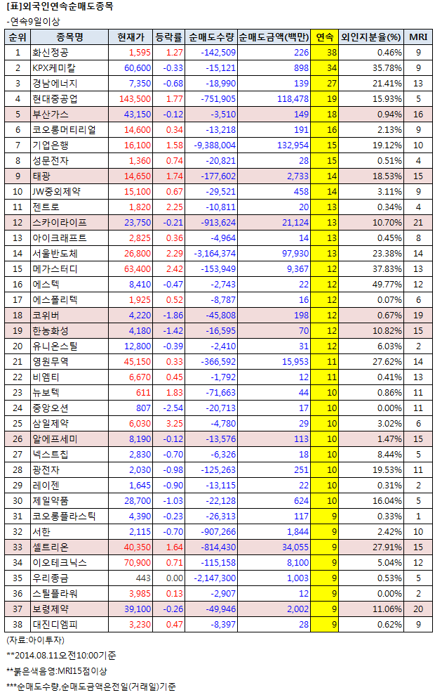 전일까지 외국인 투자자가 9일 이상 연속 순매도한 종목은 모두 38개로 화신정공1,301원, ▼-1원, -0.08%(38일), KPX케미칼51,700원, ▼-1,200원, -2.27%(34일), 경남에너지(27일) 등의 연속 순매도 기간이 길었다.