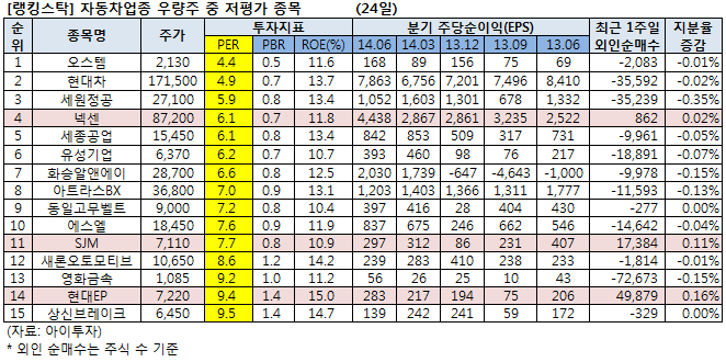 이 가운데 오스템1,043원, ▲11원, 1.07%의 PER이 4.4배로 자동차 업종 우량주 중에서 가장 낮았다. ROE는 11.6%, PBR은 0.5배다. 그 외 현대차261,500원, ▲4,000원, 1.55%, 세원정공11,920원, ▼-100원, -0.83%, 넥센5,660원, ▲60원, 1.07%, 세종공업, 유성기업2,005원, ▲21원, 1.06%, 화승알앤에이3,165원, ▲50원, 1.61%, 아트라스BX, 동일고무벨트6,900원, ▲40원, 0.58%, 에스엘38,000원, ▲850원, 2.29%, SJM3,650원, ▲20원, 0.55%, 새론오토모티브3,135원, ▲35원, 1.13%, 영화금속880원, ▼-4원, -0.45%, HDC현대EP4,040원, ▲65원, 1.64%, 상신브레이크2,620원, ▲15원, 0.58%가 상위 15선에 해당했다.