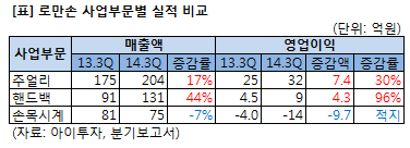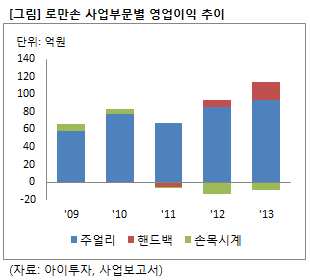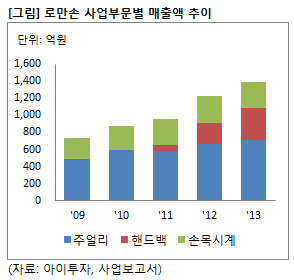 2012년부터 로만손의 주얼리사업과 핸드백사업 매출액과 영업이익은 꾸준히 늘었다. 로만손은 1988년 손목시계 제조·판매 업체로 설립됐다. 1998년 한국금융위기로 영업 환경이 크게 악화되자 2002년 주얼리로 사업영역을 확대, 2003년 제이에스티나(J.Estina) 브랜드를 내놓았다. 이후 로만손은 다양한 간접 광고를 활용해 점유율을 높이기 시작했다. 2003년 5개로 시작한 주얼리 매장은 2004년 27개, 2005년 51개로 빠르게 확대됐다. 2011년 이후 90개 내외를 유지하고 있다. 이후 영업이익이 특히 개선됐다.