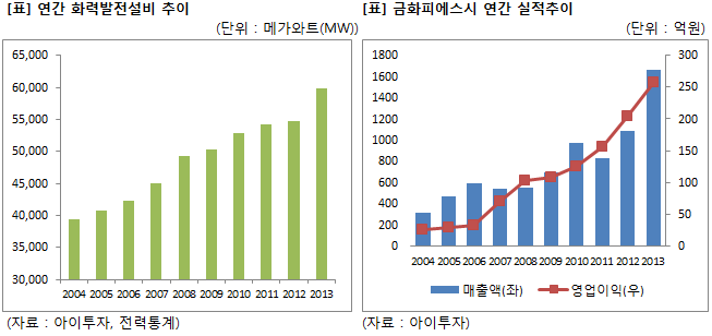 최근 10년간 발전설비가 늘어나면서 금화피에스시의 연간 매출액도 꾸준히 늘어났다. 지난 2004년 화력발전설비는 3만9366메가와트(MW)에서 지난해 5만9799MW로 52% 증가했다. 같은 기간 금화피에스시의 연간 매출액은 314억원에서 1661억원으로 429%, 영업이익은 25억원에서 257억원으로 930%씩 늘어났다. 한화투자증권에 따르면 서비스를 제공하는 발전소가 증가하고 있고, 경상정비에 대한 단가가 점차 높아져 실적 증가폭이 더욱 큰 것으로 추정된다.