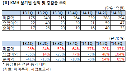 위의 기업정보는 한국투자교육연구소가 사업보고서, IR 자료, 뉴스, 업계동향 등 해당 기업의 각종 자료를 참고해 지속적으로 업데이트 합니다. KMH의 정보는 2014년 12월 03일에 최종 업데이트 됐습니다.