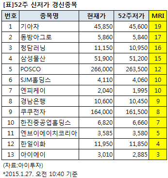 기아차 동방아그로 청담러닝 삼성물산 POSCO SJM홀딩스 엔피케이 경남은행 쿠쿠전자 한진중공업홀딩스 엔브이에이치코리아 한일이화 아이에이