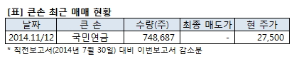 지난해 11월 12일 국민연금은 GS건설 지분을 일부 처분했다고 공시했다. 최근 거래일인 지난 11월 12일 기준 보유량은 4.95%로 직전보고서(2014년 7월 30일) 대비 1.06%P(74만8687주) 줄었다.