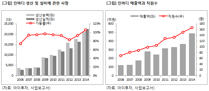 최근 인바디의 생산능력을 꾸준히 늘렸지만 가동률은 90% 이상을 유지하고 있다. 사업보고서에 따르면 인바디는 생산인력을 증원해 생산능력(1일 생산가능 수량)을 키웠다. 매출이 큰 폭으로 늘기 시작한 2008년 직원수는 81명에서 지난해 167명으로 2배 이상 증가했다. 같은 기간 생산능력은 4030대에서 2만1168대로 증가했다. 하지만 지난해 가동률이 106%로 100%를 넘어서자 공장 신축을 결정한 것으로 보인다.