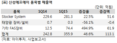 신성에프에이의 지난 1분기 실적은 전년 동기 대비 개선됐다. 개별 기준 매출액은 356억원으로 46.6%, 영업이익은 149억원으로 22.7% 증가했다. 공정물류자동화 장비인 기타 FAS장비 매출액이 74억원으로 전년 동기 대비 494.9%(62억원) 급증했고, 스토커 시스템(Stocker System)도 281억원으로 22.5%(52억원) 늘었다. 최근 국내 및 중화권 디스플레이 업체의 설비투자가 지속되고 있는 결과로 풀이된다.